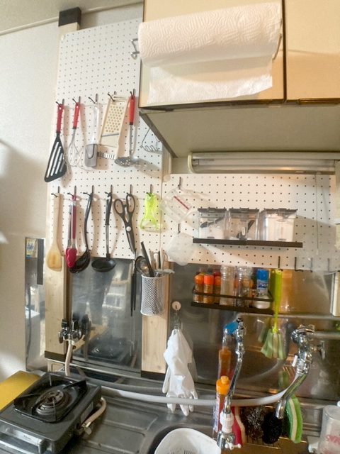 キッチンパネルの上に有穴ボードを付け、キッチン周りの調理器具が取り出しやすく、見た目もスッキリしています。シンデレラフィットを意識されているせいか、台所周りの様々なアイテムがとても整理されており、お料理が楽しくなりそうです。