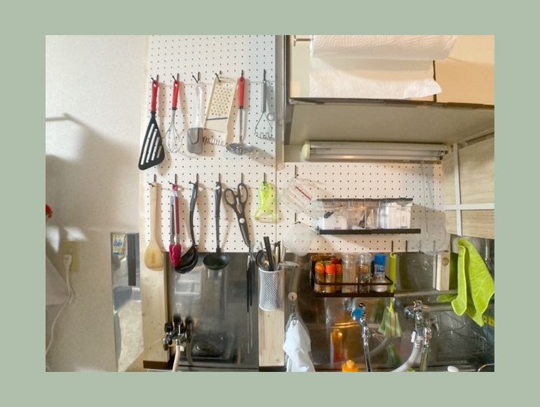 キッチンパネルの上に有穴ボードを付け、キッチン周りの調理器具が取り出しやすく、見た目もスッキリしています。シンデレラフィットを意識されているせいか、台所周りの様々なアイテムがとても整理されており、お料理が楽しくなりそうです。